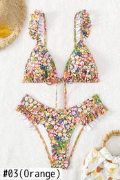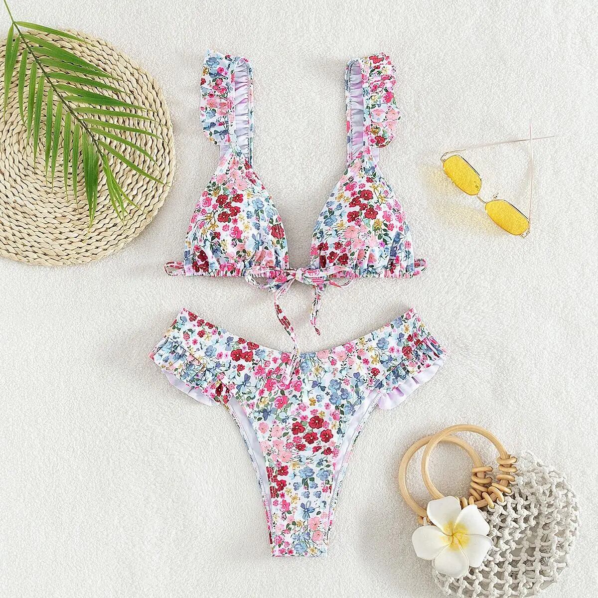 送料無料 2024 花柄レディース水着、フリル サスペンダー バックレス ウエスト 2 ピース ビキニ、ブラジル ビーチ水着水着 AE33232335565837334133