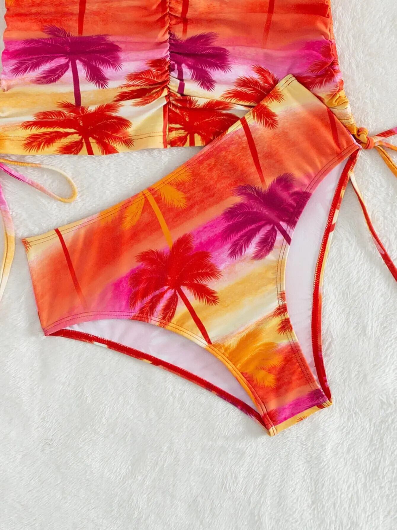 送料無料 レッドストラップレス水着女性 2023 セクシーなココナッツツリープリントツーピースリンクルビキニ巾着レースアップ保守的なタンキニ AE33232335588544034621