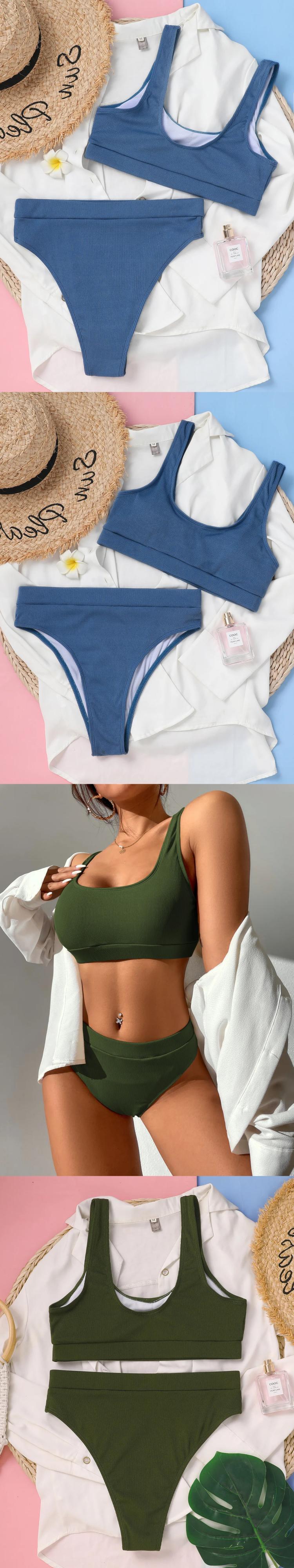 送料無料 2023 ソリッドカラービキニ 2 ピース水着女性のセクシーな U ネックサスペンダー背中の開いたビーチ水着ウエスト水着 PXZH29 AE332323355377277576