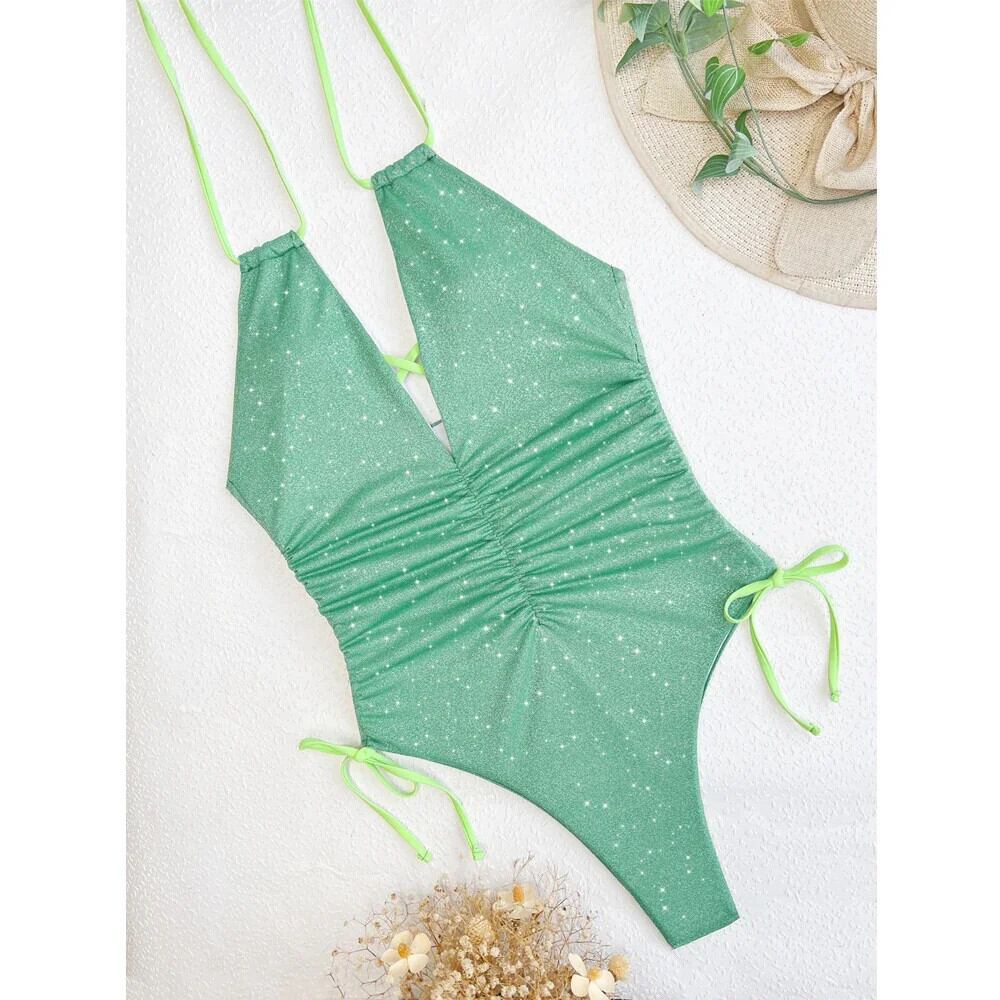 送料無料 2024 グリーンワンピース水着女性巾着プリーツビキニ V ネックサスペンダー背中の開いた水着夏の Tバックビーチモノキニ サマー 夏物 Vネック AE33232335551529003074