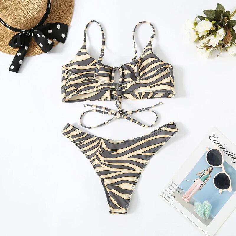 送料無料 ゼブラストライププリントツーピース水着女性 2023 ローウエストビキニ巾着サスペンダー背中の開いた水着ビーチ水着 AE33232335575342603878