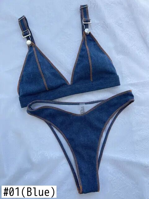 送料無料 デニムブルー水着女性 2023 ウエスト 2 ピースビキニセクシーな三角形カップ V ネックサスペンダー背中の開いた水着水着 LG115 Vネック AE33232335562237504667