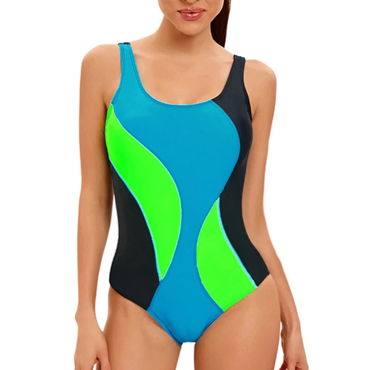 送料無料 スポーツパッチワーク水着女性、保守的なワンピース水着、U ネックサスペンダー背中の開いたモノキニ、ビーチ水着、新品 AE33232335581743393158