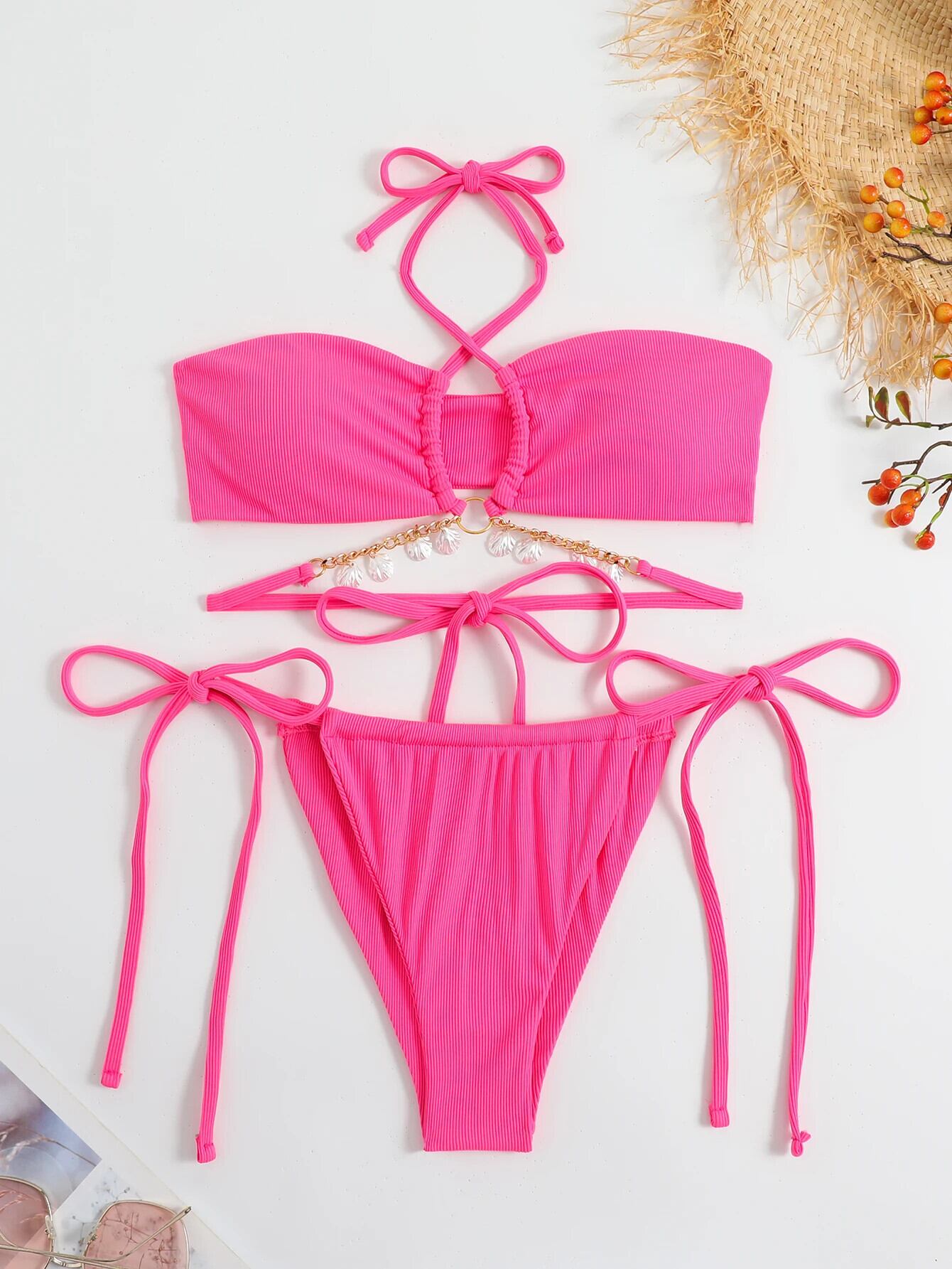送料無料 水着女性 2023 ビキニローズレッドツーピース水着ラインストーンチェーンホルターストラップ水着レースアップ背中の開いたビーチウェア AE33232335560181964644