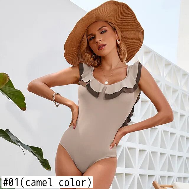 送料無料 ソリッドカラー水着女性 2024 セクシーなフリルワンピース水着 U ネックカラーマッチング背中の開いたビキニビーチウェア夏のモノキニ サマー 夏物 AE33232335541038573599