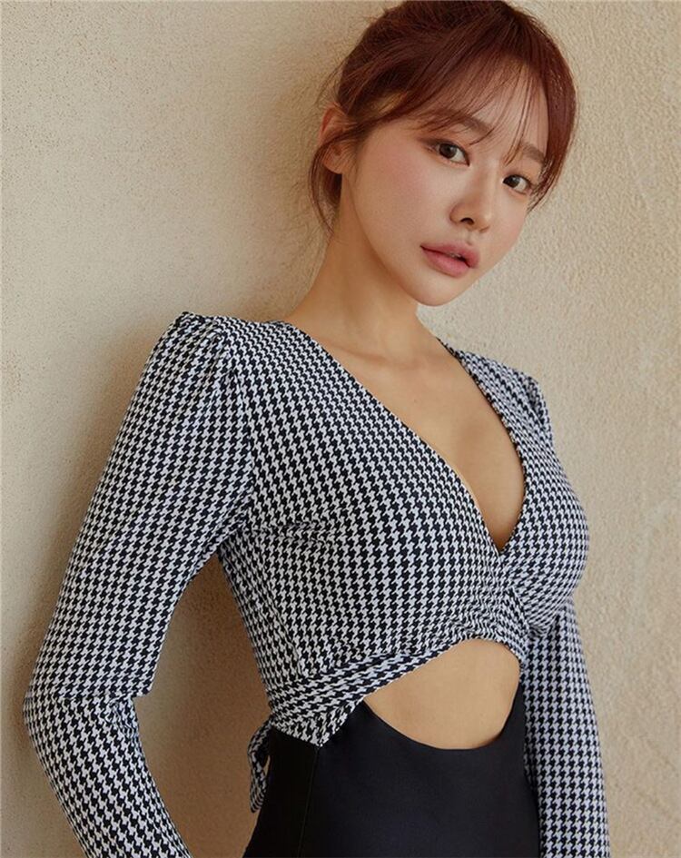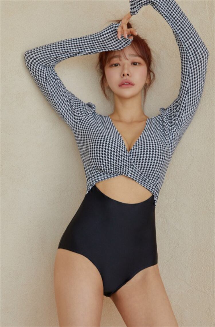 送料無料 2024 ワンピース水着女性、チェック柄プリントパッチワークビキニ、ハイウエスト中空長袖 V ネック水着、ビーチウェア ハイウェスト ロング レッド Vネック AE33232335567153405540