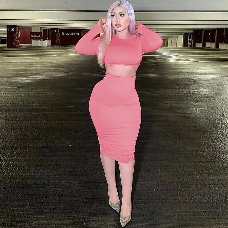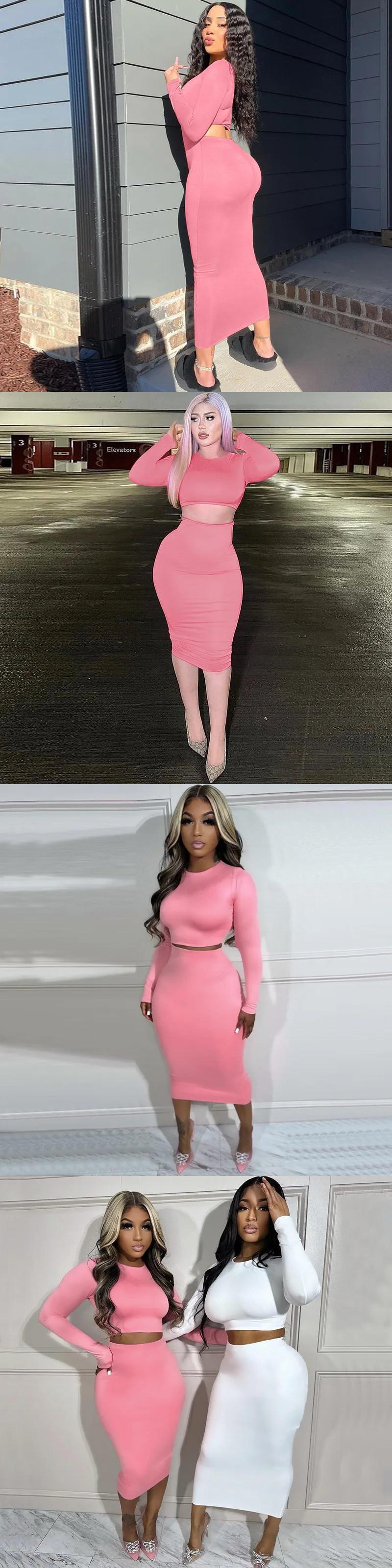 送料無料 ヒップラップスカートセット女性、無地、長袖、ラウンドネック、ハイウエスト、裸ショートタイトトップ、2023秋、ミルクシルク生地 ハイウェスト ロング オータム 秋物 Oネック ソリッドカラー AE3323233554841941329
