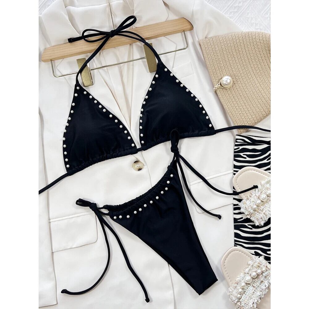 送料無料 黒マイクロビキニ 2024 夏 2 ピース水着女性のセクシーな三角形カップサスペンダー水着ローウエスト Tバック夏のビーチウェア ブラック サマー 夏物 AE3323233558313408573