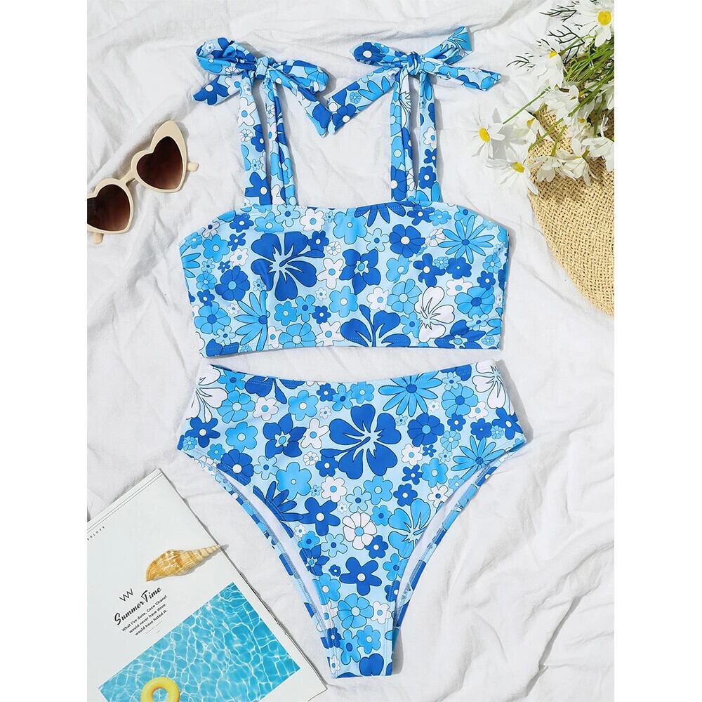 送料無料 ブルーフラワープリント水着女性 2023 ウエスト 2 ピースビキニセットセクシーなレースアップサスペンダービーチ水着 PXFF415 フラワーデザイン AE33232335587750458485