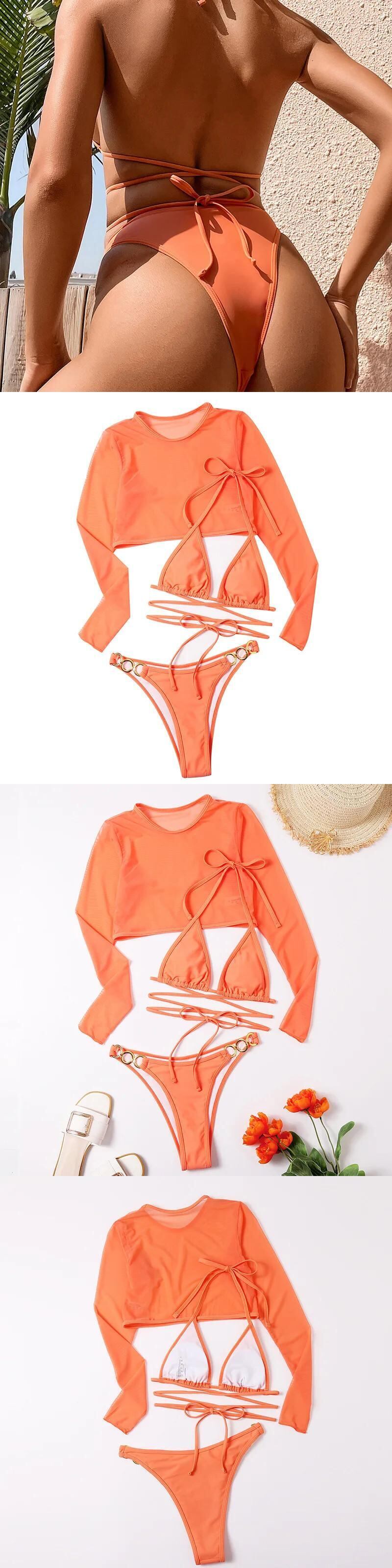 送料無料 ソリッドカラー 3 ピース水着女性 2023 長袖メッシュカバーアップビキニウエスト Tバックビーチ水着水着 Biquini ロング AE33232335514006728837