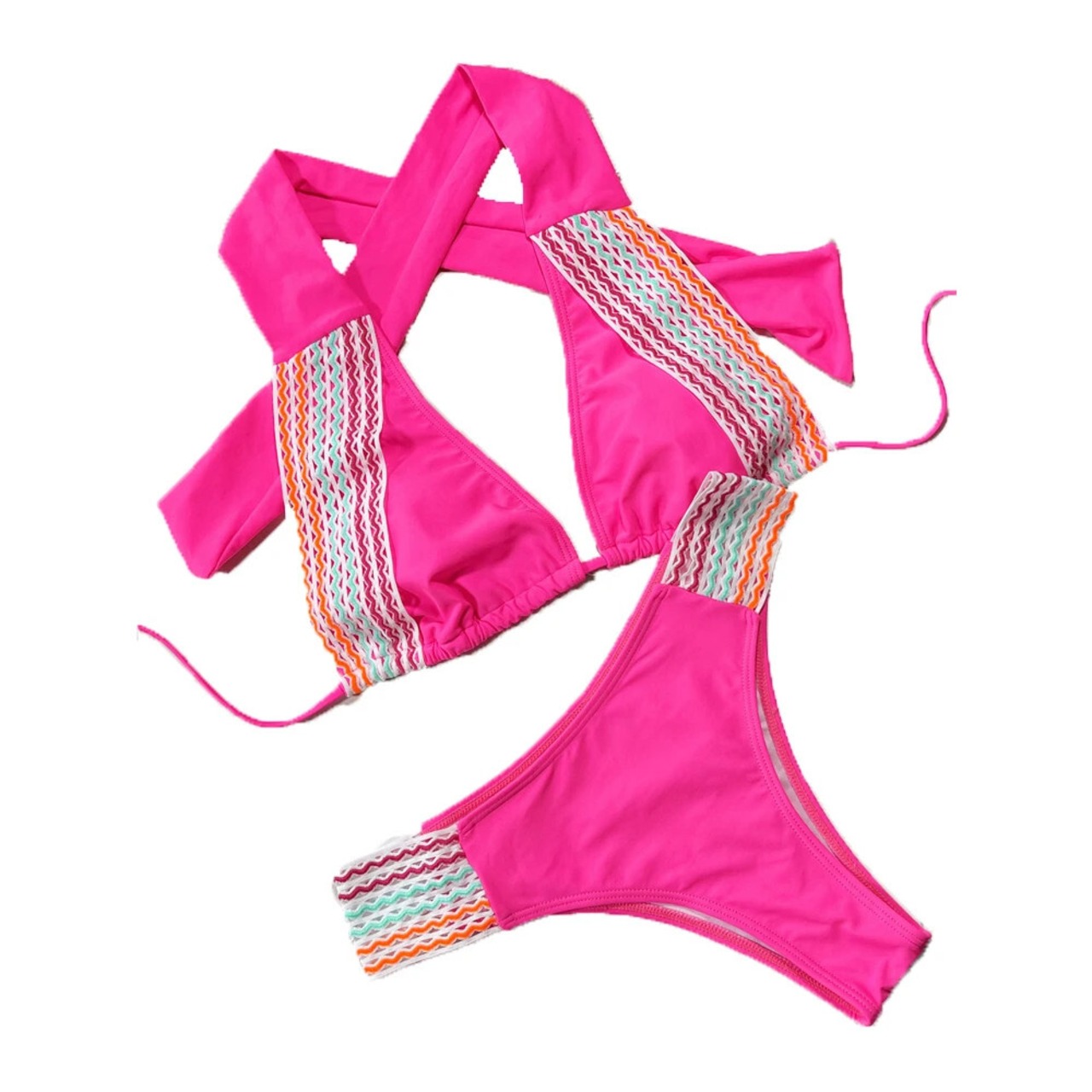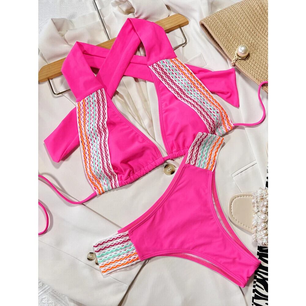 送料無料 2023 ソリッドカラースプライシングビキニ女性 2 ピース水着セクシーな中空アウトホルターレースアップ背中の開いた水着ウエスト水着 AE33232335593634129573