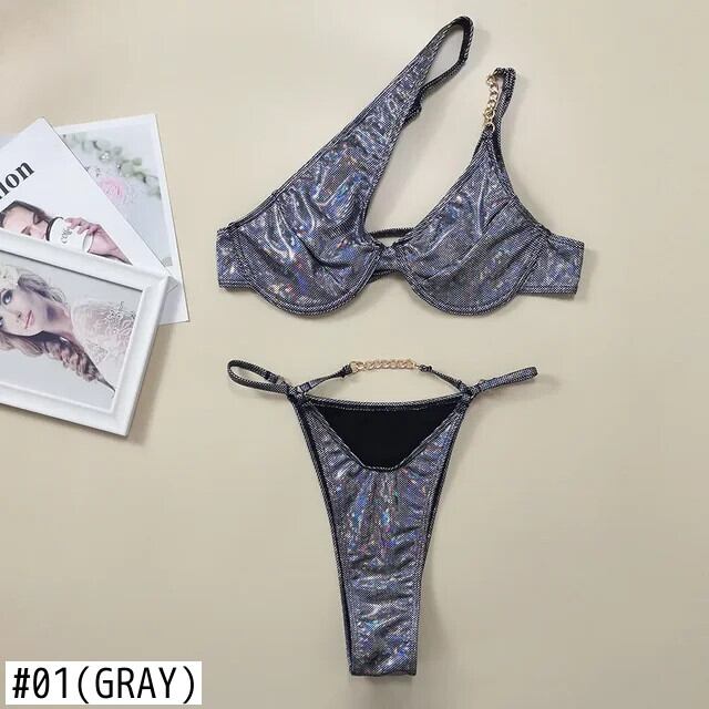 送料無料 光沢のある水着 2023 女性のメタルチェーンビキニ不規則なシングルショルダー中空アウトツーピース水着水着 YSM230290 AE33232335588012214032