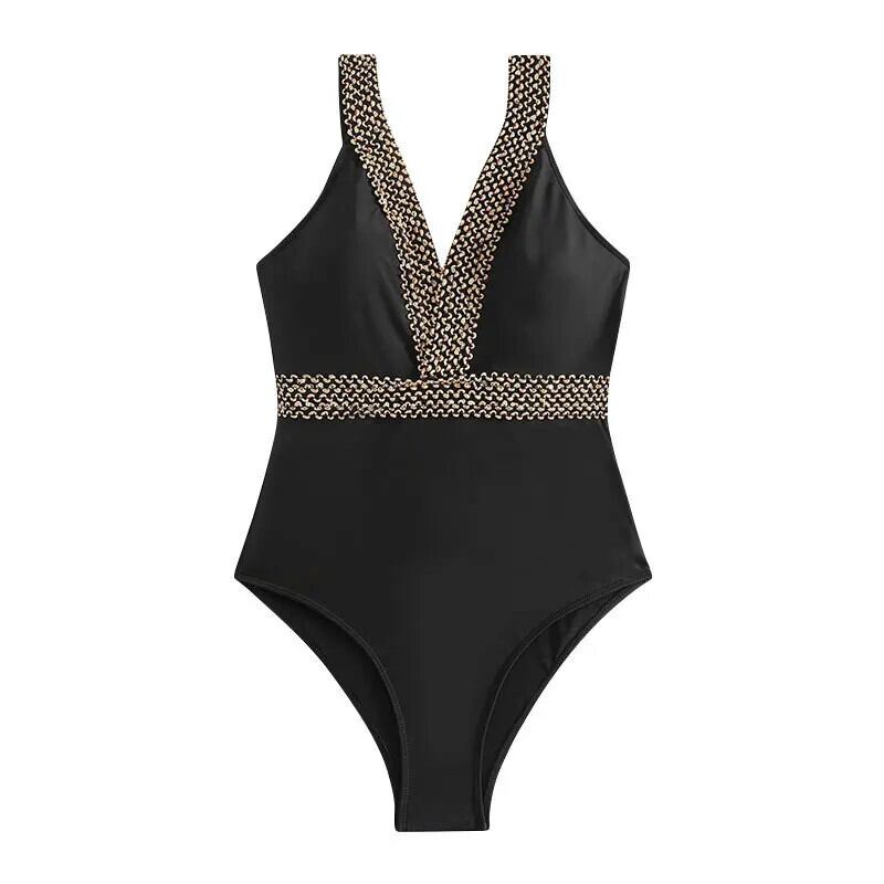 送料無料 ブラックパッチワークワンピース水着女性、保守的な水着、Vネックサスペンダーバックレスビキニ、夏スリムビーチモノキニ サマー 夏物 AE33232335546690643965
