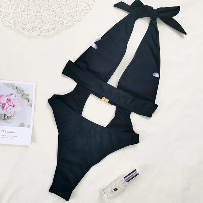 送料無料 2024 ホワイトブラックホルターディープ V ネックモノキニワンピース水着女性水着カット入浴者水着水泳女性 Vネック AE88976628281334521