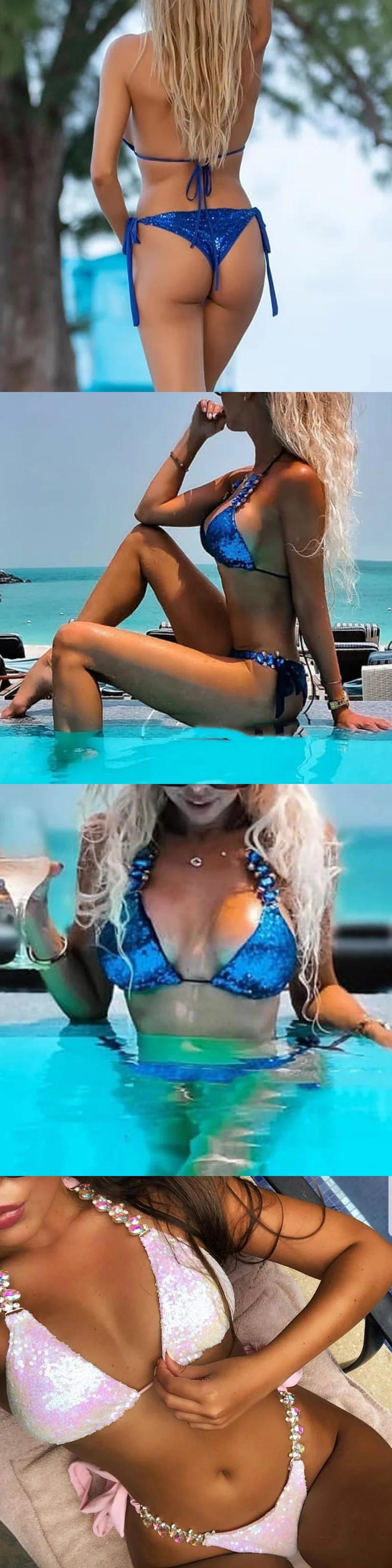 送料無料 光沢のあるスパンコールラインストーンダイヤモンドビキニ女性水着水着 2 個ビキニセットホルター入浴者水着水泳 AE88976620431889528