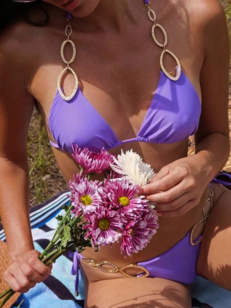 送料無料 セクシーなホルターダイヤモンドビキニ女性水着金属チェーン水着二枚ビキニセットブラジル入浴者水着水泳 AE88976680723058866