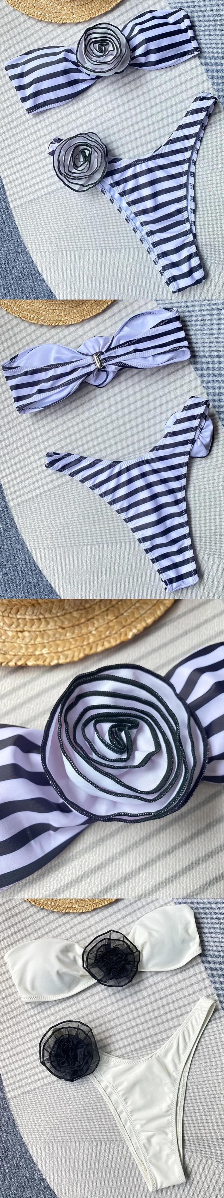 送料無料 3D 花ストライプビキニバンドービキニ 2024 水着女性水着ツーピースビキニセット三角水着水泳 フラワーデザイン AE88976657897981629